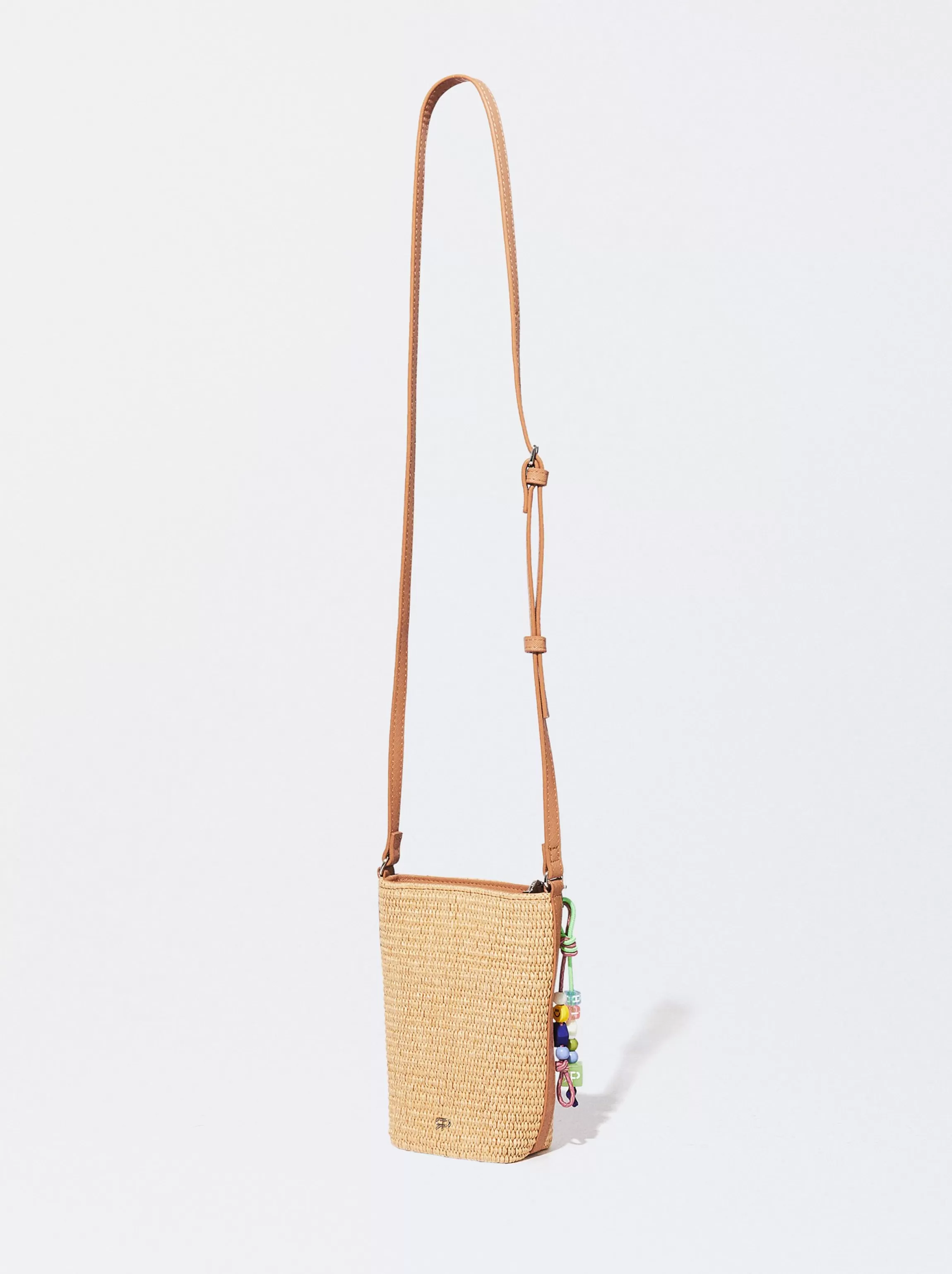 Bolso para móvil de paja con colgante extraíble. Asa de bandolera ajustable. Cierre de cremallera.