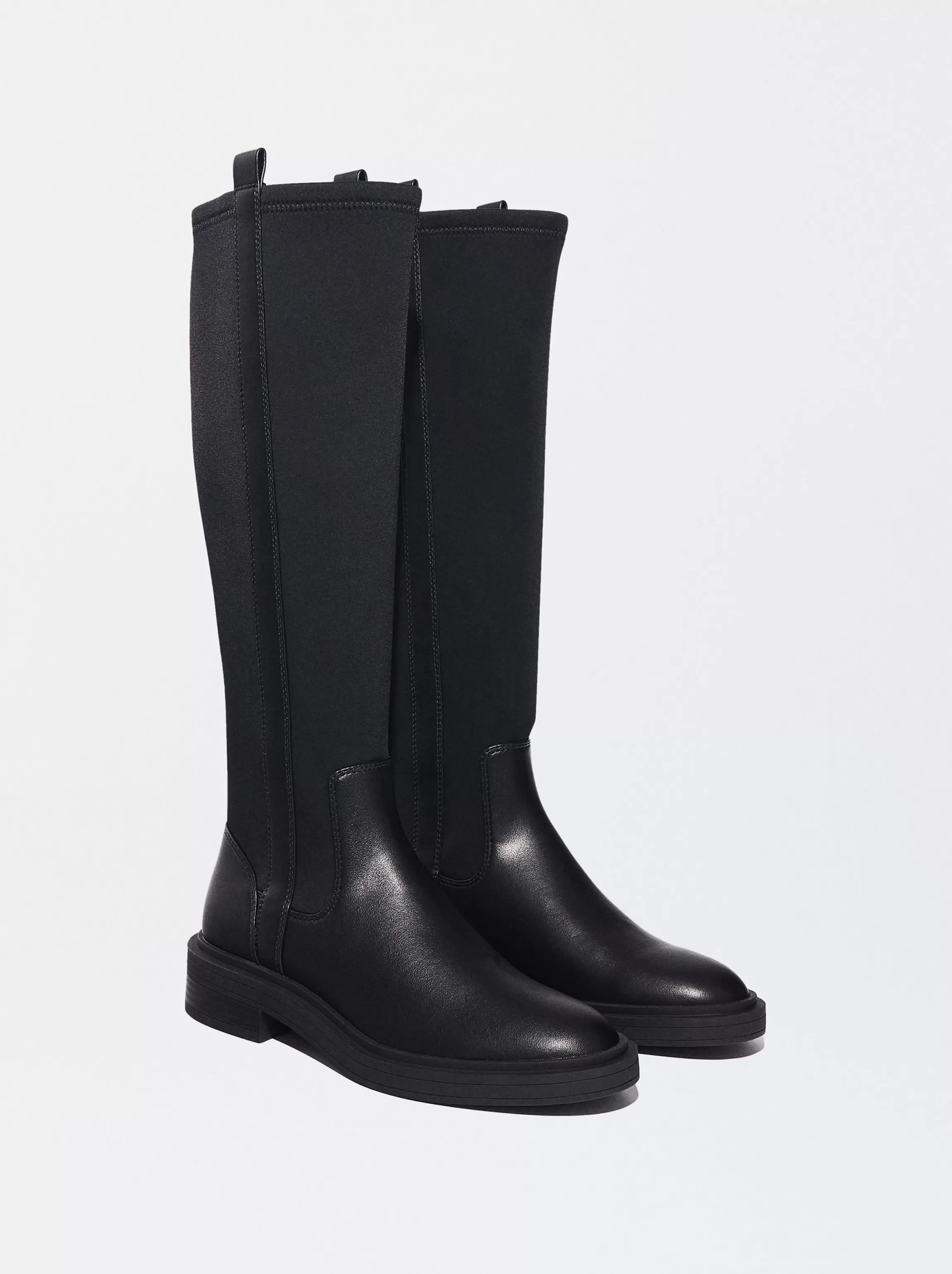 Bota plana estilo ecuestre de caña alta combinada con tejido elástico.Composición Interior: 60% Poliéster, 40% PoliuretanoPlantilla: 100% PoliuretanoSuela: 100% CauchoCuerpo: 60% Poliéster, 40% Poliuretano