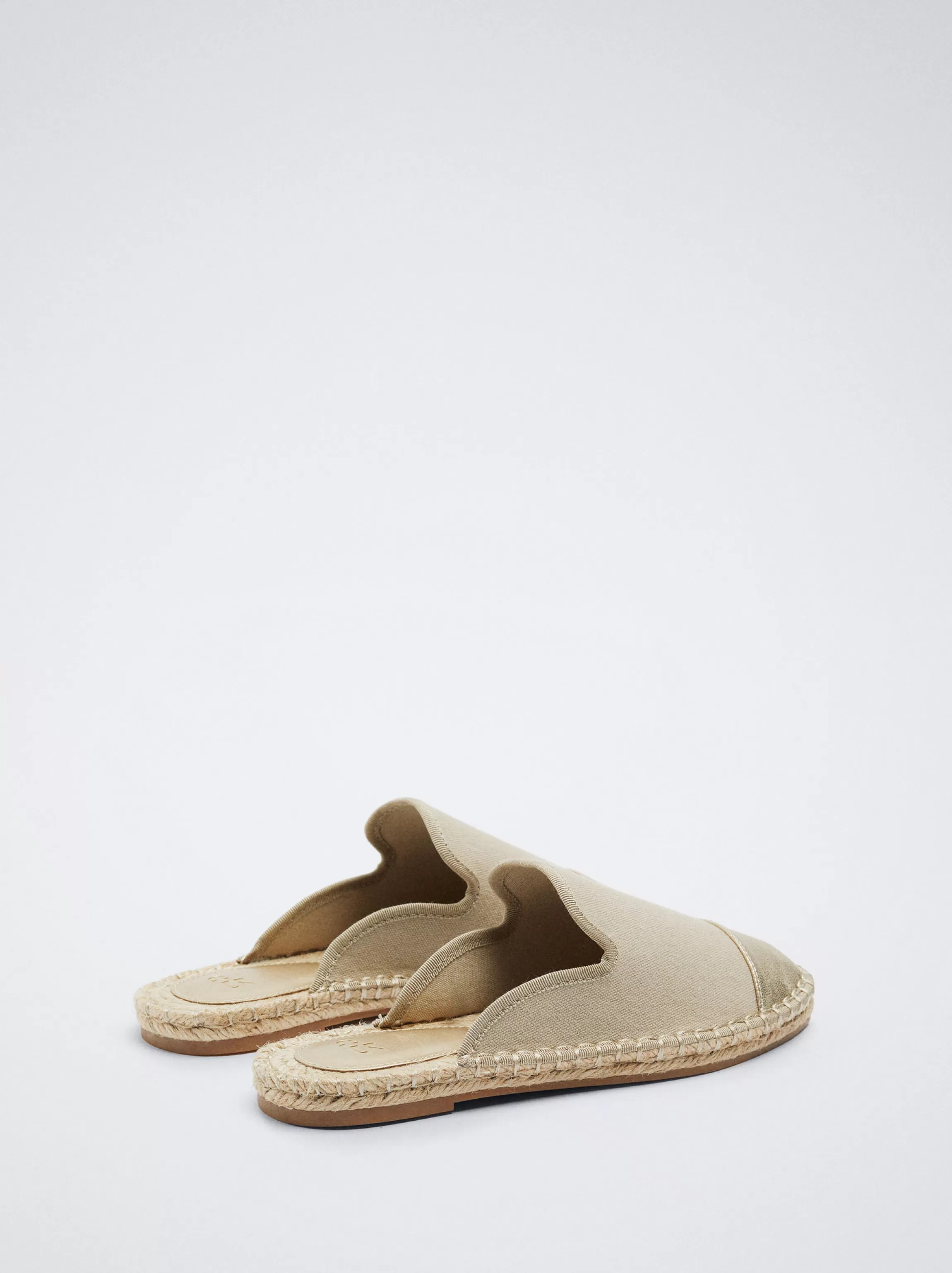 Zapato plano tipo mules confeccionado en tejido en mezcla de yute. Detalle metalizado en la parte delantera.