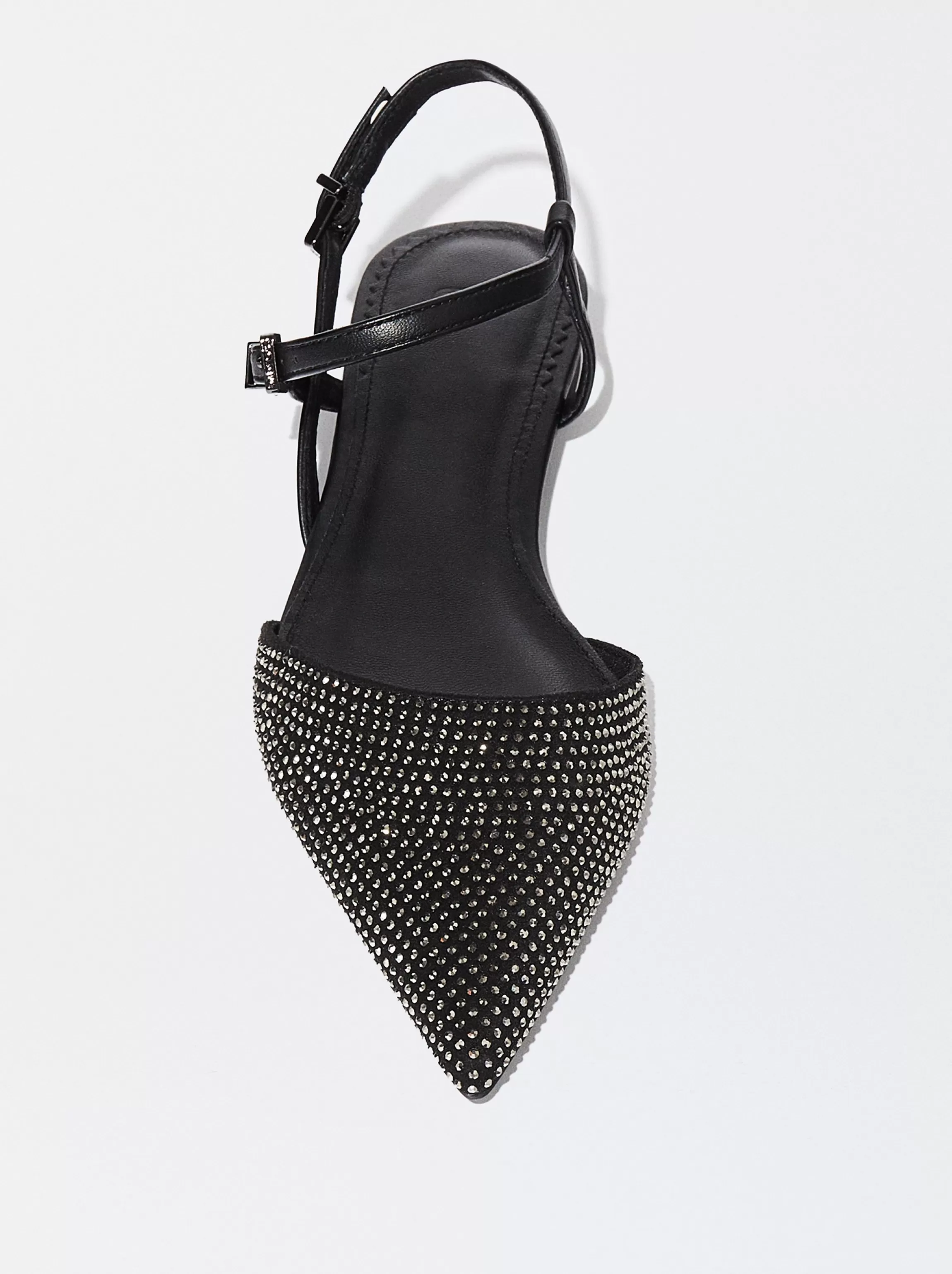 Bailarina destalonada, con parte delantera con brillantes. Acabada en punta. Cierre de hebilla en pulsera de tobillo.